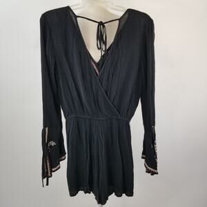 Band of Gypsies Black Pink Embroidered Floral Boho Tie Neck Romper NEW Size S