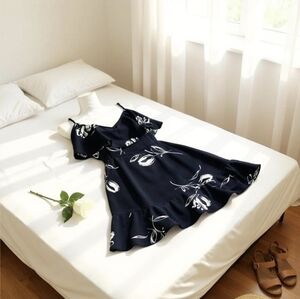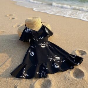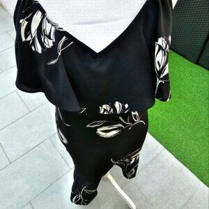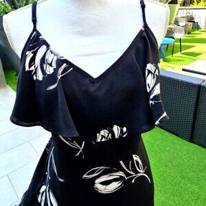 Designed in a black & white floral print ✦ ruffle neckline ✦ lace‑up back w/ keyhole detail ✦ ruffle hem ✦ midi length ✦ high‑low silhouette ✦ lightweight stretch poly‑blend, this piece is perfect for brunches, festivals, or summer weddings.
