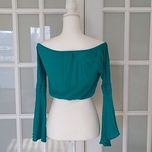 Off the shoulder crop top features crochet mid sleeve detail, beautiful bell sleeves and elastic at top and bottom to stay in place.