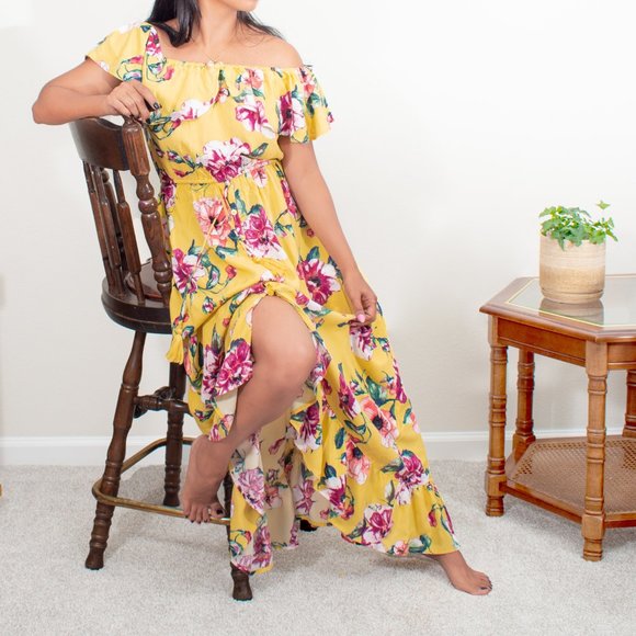 Band of Gypsies M Yellow and Pink Floral Button Tied Off Shoulder Viscose Hi-Low