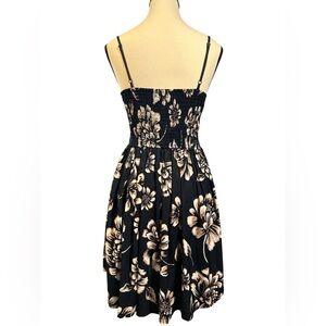 This elegant navy and tan mini dress by Band of Gypsies features a sweetheart neckline and spaghetti straps. It has adjustable straps and a padded wireless bra. It is fully smocked in the back making for a comfortable fit. The flare silhouette offers a flattering shape, perfect for wedding guests or a night out. It gives the dress a fun flirty vintage feel. Its sophisticated style and versatile color make it a standout choice for any occasion.