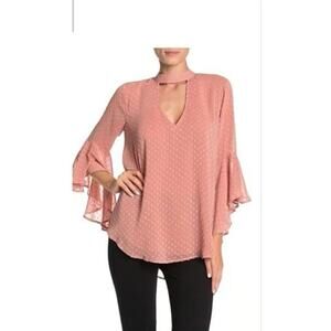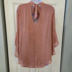 Add a touch of bohemian style to your wardrobe with this Band of Gypsies blouse in a beautiful blush pink color. The V-neckline and bell sleeves with ruffle accents and a bow closure add a feminine touch to this relaxed fit blouse. The Swiss dots pattern adds a fun and colorful touch to the blouse, making it perfect for any occasion, whether it's a casual day out, a party, or even workwear. Made of lightweight and breathable polyester material, this blouse is perfect for all seasons and is machine washable for easy care. This blouse is a must-have for any boho-chic or preppy-retro inspired wardrobe.