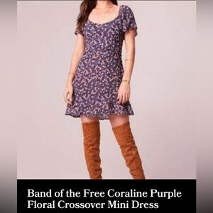 This charming mini sundress by Band of Gypsies features a vibrant purple color with a delicate floral pattern. It has short puff sleeves and a flattering scoop neck, making it perfect for a casual night out or cocktail event.