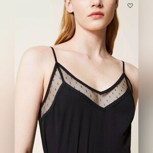 - Meshy dotted lace trim ruffle hem detail at top and bottom.