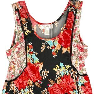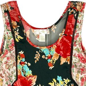 Feminine flouncy floral top from Band of Gypsies. Although lined in the front, the rest of the top is sheer and airy. Chain piping between the front and back rose panels and the side pretty posie side panels helps keep you cool.