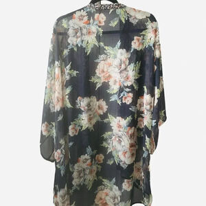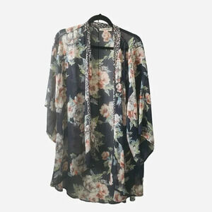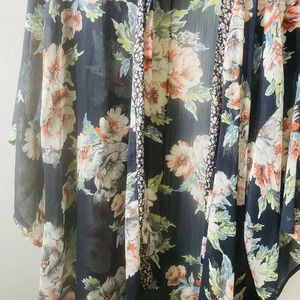 Band of Gypsies Women SZ XS Navy Blue Floral Tunic Length Open Front Kimono