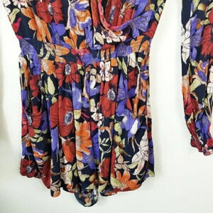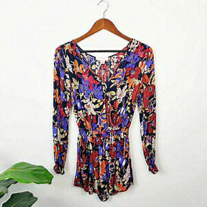 Band of Gypsies Women's XS Elastic Waist Long Sleeve Blue Floral Crepe Romper