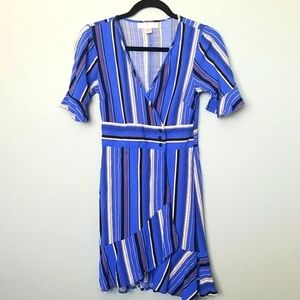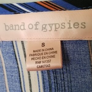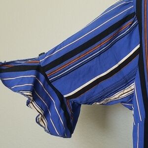 Royal blue with ivory orange and black stripes. Buttons on the inside as well as the outside. Asymmetrical hem, has a ruffle like bottom hem. Cute ruffle sleeves with button closure. Tiny snags on one arm, see close up. Fabric doesn't stretch but there is elastic smocking in the back for stretch if needed. Viscose. summer, spring, casual, brunch, beach, airy, fun, festival, colorful, hang out, boho, eclectic, whimsical, feminine, Artsy, retro fit, dainty