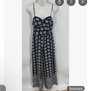 These pictures honestly do this piece no justice This jumpsuit by ‘Band of Gypsies’ has a beautiful silhouette with the seam work design of a corset into a super flowy wide leg Lite padding in the cups so bra-less is a go👌😆 Accordion style elastic at the back bodice to slip in&out The material is lite &breathable w tons of movement- so u will sway with each step I 💗 it Def rock it with some chunky platforms and a headband for a dope AF 70s vibe if it fit me it would be going NO WHERE😂