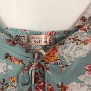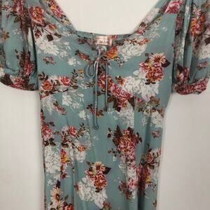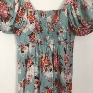 Band of Gypsy women's floral mini dress. Sweetheart neck. Short puff sleeves. Smocked upper back. Unlined. In good used condition. No stains, tears or holes.