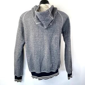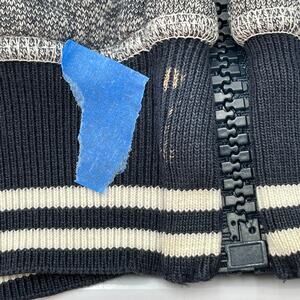 Preowned item in excellent condition. One spot of paint on the front hem denoted with blue tape. From Scott Sternberg's first iteration of the BOO Label. Navy/White stripes on the cuff & hem. Wooden ballon drawcords, large navy zipper and white overlock stitching details. Raglan style sleeves.