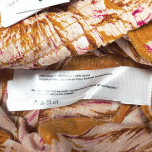 ● Golden-tan backdrop with blush floral print on breezy viscose.