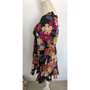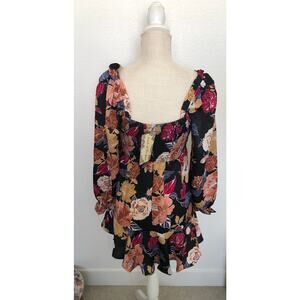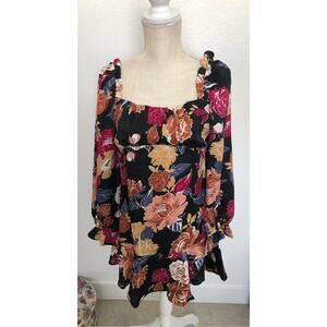 This darling dress is perfect for transitioning into summer. It is a black mini-dress that features a bright floral pattern that is sure to brighten your day. It is a satin material that has a little shine. The neckline is a flattering square neckline that is accented with long sleeves that have an elastic cuff that ruffles. The bodice is a smocked back so it is comfortable. The hemline hits above the knee or mid-thigh. The material is a little bit sheer so I would suggest nude undergarments, I did not notice until I held it up to the sun. New with tags.