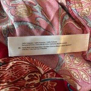 So cute floral dress with elastic waist and short balloon type sleeves. Dress is tiered with mini ruffles, has v-neck surrounded by ruffle, and tassels that hang below v-neck (or can be tied). Color is Garnet Blush and is 100% polyester.