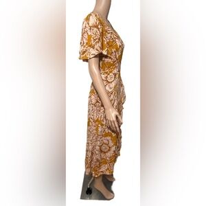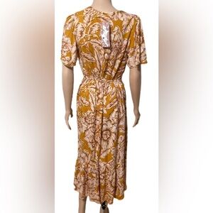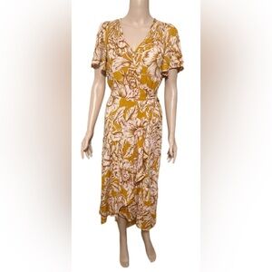 Band of the Free Boho Floral Wrap Dress XS Gold Blush Pink Midi Ruffle Hem NWT