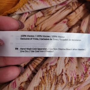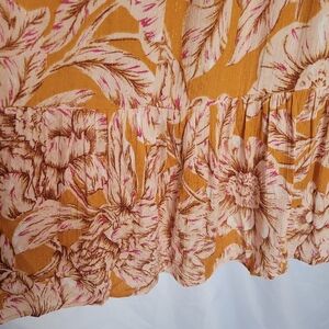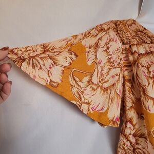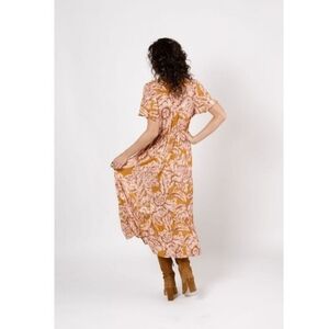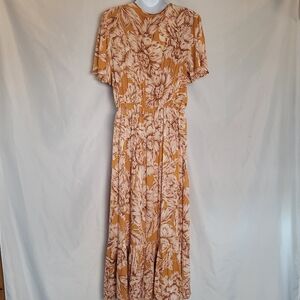 Band of the Free Heather Gold Floral Maxi Wrap Dress. Women's size large. Has short ruffle sleeves and a vee neck. Tie has bead detail. Has a hidden inside button for closure and a snap at the chest. Fitted at waist. New with tags. Measurements are approximate and are shown in photos.