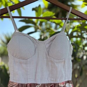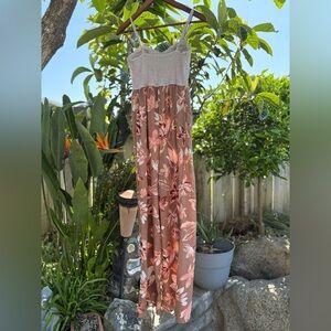 Linen Padded Corset with Adjustable Straps Smocked back and floral bottom jumpsuit, featuring a beautiful blend of Mocha and Coral hues.