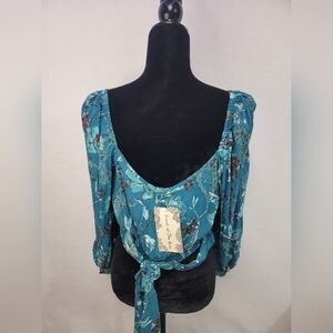 New With Tags Band Of The Free BOG Collective Women's Size Medium Sybillie Deep Teal Floral Crossover Long Sleeve Crop Top. Deep V-neck Crossover front, balloon sleeves, back tie, smocked cuffs.