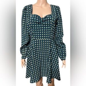 Featuring a vibrant geometric square print in shades of teal, blue, and ivory, this dress is designed with a flattering sweetheart neckline, smocked back for stretch and comfort, and long puff sleeves with elastic cuffs. The back tie adds an extra touch of charm while keeping the fit adjustable. Perfect for day-to-night transitions, concerts, or casual outings.