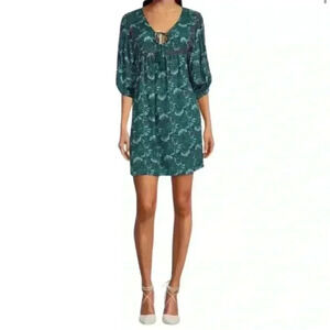 This Band of the Free Boho Mallory Floral Mini Dress comes in Deep Teal Aqua. It features pockets, ties at the neckline, and is a size large! Brand new with tags! 100% viscose material