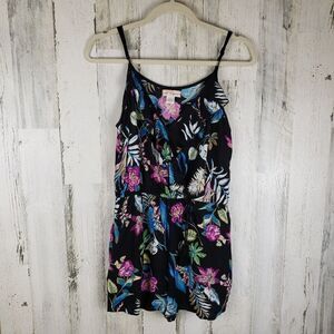 ~ Description: Pink, blue, green and white tropical floral pattern on a black background, adjustable spaghetti straps, 2 pockets, drawstring waist with tassels, surplice neckline with snap closure