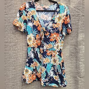 Get ready to turn heads and embrace your inner wanderlust with our Band Of Gypsies tropical romper! This vibrant V-neck beauty is the epitome of summer style. With its eye-catching colors of orange, teal, navy, and white, adorned with tropical flowers and palm leaves, you'll feel like you're on a tropical getaway wherever you go. The lightweight fabric will keep you cool and comfortable, while the flattering cut will accentuate your curves in all the right places. Whether you're strolling on the beach or dancing the night away, this romper is your ticket to effortless style and endless adventures. So go ahead, channel your inner free spirit and make a bold statement with our Band Of Gypsies tropical romper!