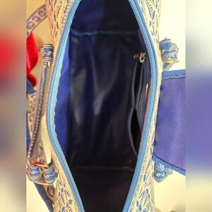 Elegant blue and cream embroidered women's bag, perfect for any occasion. Features intricate patterns and a stylish design.
