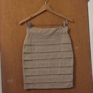 Holds up by elastic and made with stretch fabric. Works great with crop tops as well. It's a little worn with some pillage, but it still looks great!