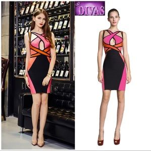 Colorful orange, black, pink, bandage dress 90% Rayon, 9%Nylon, 1% Spandex. Price is firm
