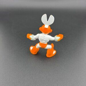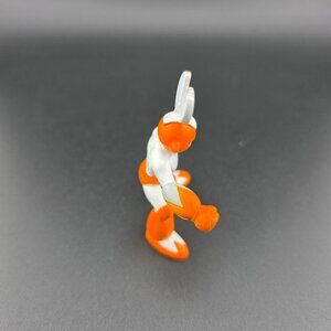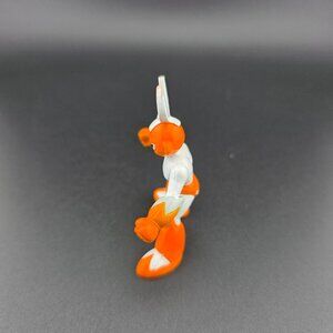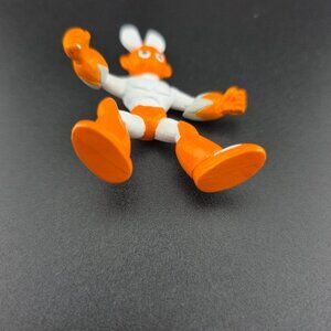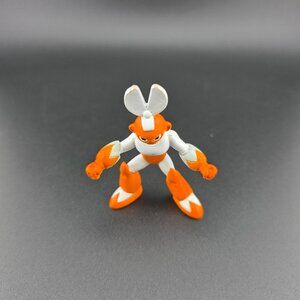 Vintage Bandai Cut Man action figure from the Mega Man franchise, measuring 2 inches tall. This collectible figure features vibrant orange and white paint with a dynamic pose. Despite being pre-owned, it’s in good displayable condition with only light paint wear on the helmet and back. A great addition for any retro gaming or Mega Man toy collection.