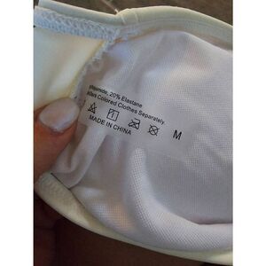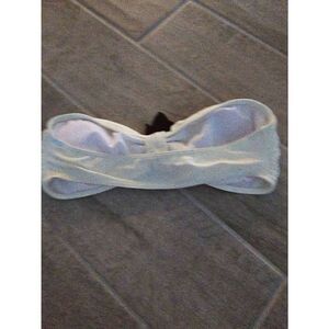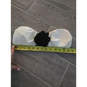 Strapless Bandeau style bikini top. Black floral applique in the center. This is more of a cream than a white. Excellent condition. Measurement is unstretched. Size medium. Super cute for bachelorette party, honeymoon.