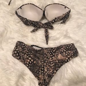 Tie back on top! Sexy gold plated Rings on bottoms. Bottoms = XS, Top= 32 D.... but very adjustable! fits me and i wear a full 34 B :) and still shows nice cleavage