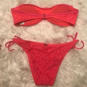 Hot pink lace covered bikini with Frilly top! Bottoms = XS, Top = Medium