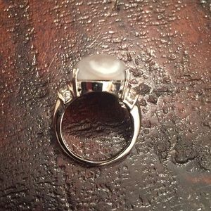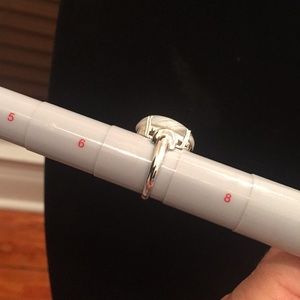 Has simulated diamonds on the shoulders. Size maybe a tight 7. Rhodium plated brass