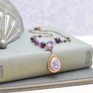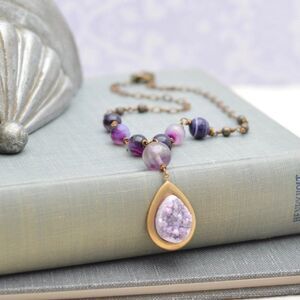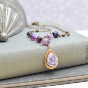 This gorgeous Banded Agate and Amethyst Druzy Pendant necklace is comprised of Banded Agate and Amethyst round beads wrapped with antiqued brass wire and attached to a chain with a matching finish. The focal piece of this necklace is an Amethyst Druzy teardrop set in an antiqued brass vintage setting.