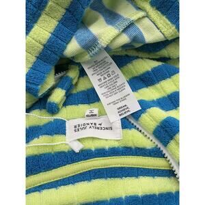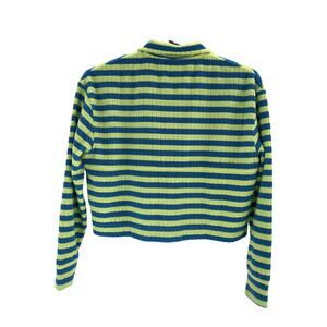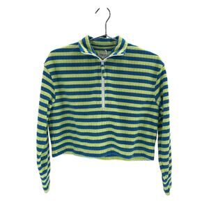 Bandier 'Holly' Blue Polyester Half Zip Sweatshirt Size XXS: mid-weight french terry, mock neck and long sleeves, striped design, partial zip placket, cropped, measurements: 20 inch bust x 18 inch length.