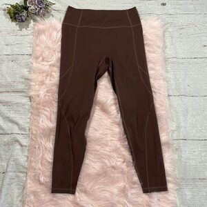 Le Ore which is sold by Bandier Lucca high rise truffle brown colored pocket leggings. These leggings are in great used condition