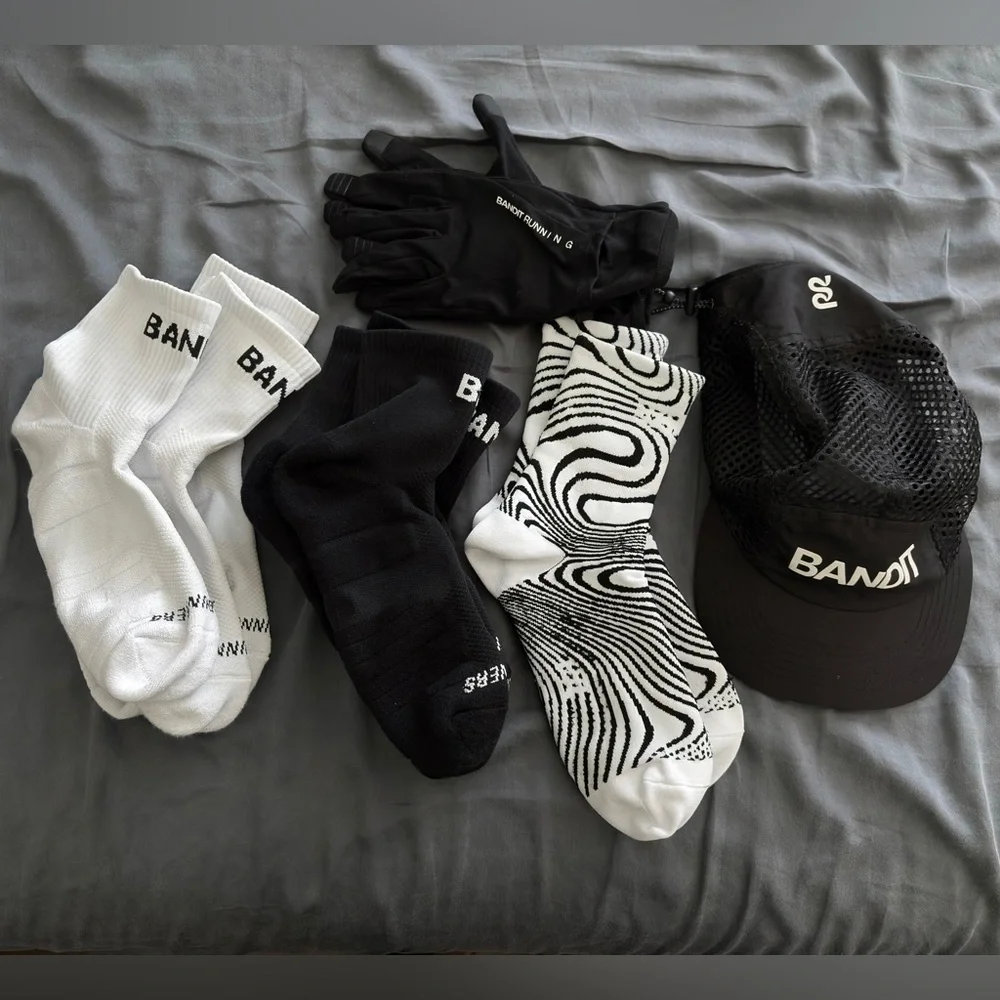 4 pairs of black/white M/L cushioned socks and one pair of light cushioned socks + Steady State Hat + Running Gloves (both have an opening for watches).