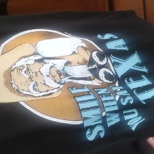 size large but not super large It's kind of more like a medium. smile when you say Texas T-shirt. I ordered p opthe T-shirt by accident and it wasn't worth it to return it now you guys get the benefit.