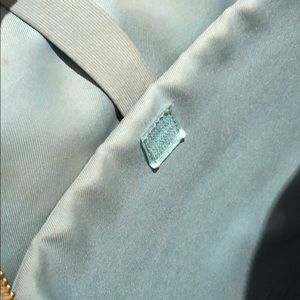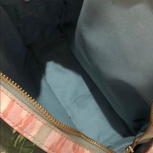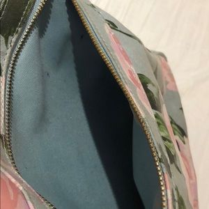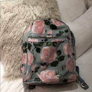 Floral pattern on light blue backpack with computer pocket inside zipper front pocket and side pockets adjustable backpack straps and top handle zipper closure very sturdy shows some wear and tear on it in photos but over all great bag