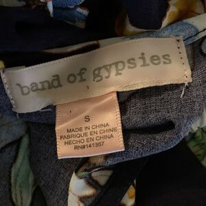 Band of Gypsies navy and floral jumpsuit with overall stretch, pox, elastic waistband and button back closure. Bust 36”, sleeve 13”, waist 34”, inseam 30” and rise 14”.