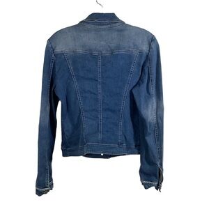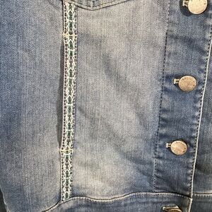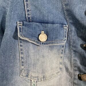 Bandolera Women’s Denim Distressed Jean Jacket With Ribbon Trim. Size 12. There is a small stain just under the right front pocket. See pics. Shoulder to shoulder 16”, armpit to armpit 18”, neck to hem 19”, shoulder to cuff 24”. Good used condition. LJ98