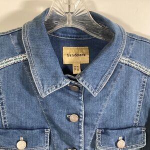 Bandolera Women’s Denim Distressed Jean Jacket With Ribbon Trim. Size 12