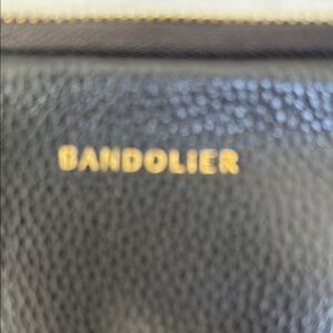 Elegant black leather pouch by Bandolier. Gold zipper and accents add a touch of luxury. Slight discoloration on gold zipper pull and on the tiny studs as shown in photos