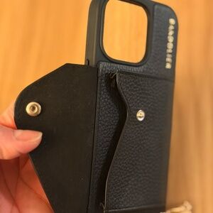 100% genuine leather phone case with gold details for the iPhone 16 Pro. This case has a snap closure wallet that can fit 3-4 cards and has built-in hooks for straps. Comes with a thin gold strap (not Bandolier) that is perfect for going out, but can also be switched for the strap or wristlet of your choosing.