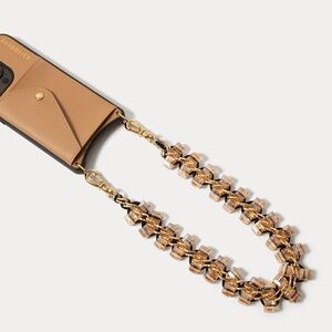 Elegant Bandolier wristlet case in tan. Features gold chain detail. Perfect for style and convenience.