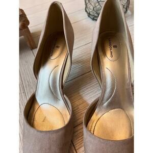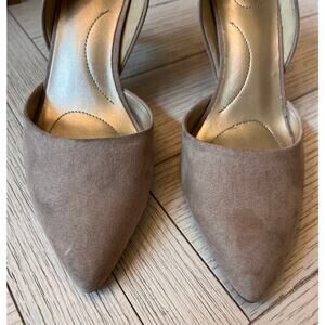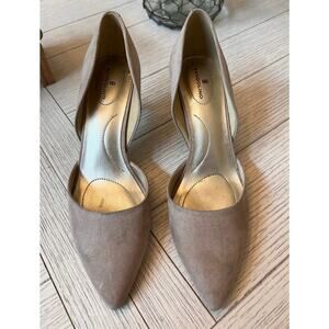 Bandolina tan suede like 3" heels. Textile upper. Sz 9 ladies. Toes could be cleaned