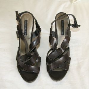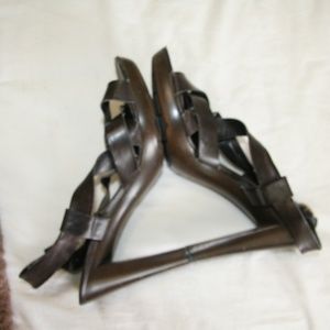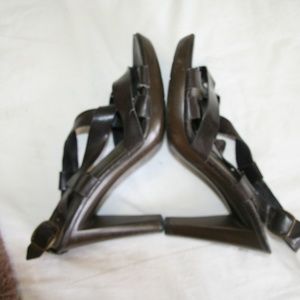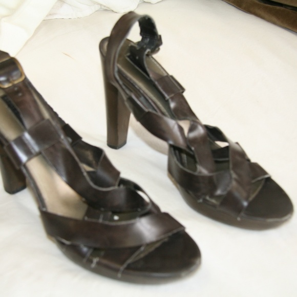 Bandolino size 8 brown strappy open toed Sandal heel . Preowned some marks around shoe. inside of straps has wear as well as wear on toe, heel and bottom sole. Overall good condition. Adjustable buckle ankle strap., VERY comfortable. About 3/4” platform and 4.5” heel.
