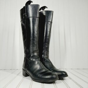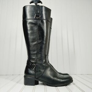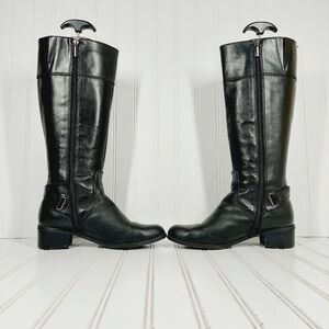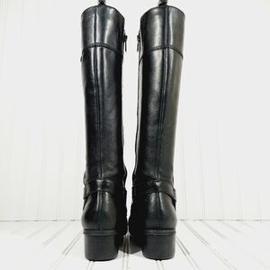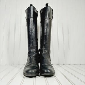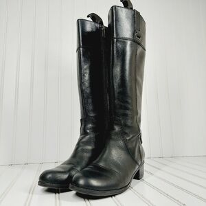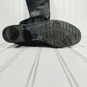 Sleek black leather boots. Stylish heeled design. Perfect for any occasion.***Heels have wear***