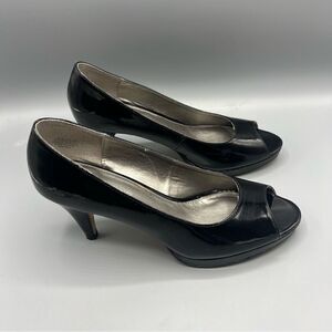 Bandolino Black Open Toe Heels Pumps. Good pre-owned condition! 3 inch heel Cushion footbed Minor scuffs, please see pictures. Size 8